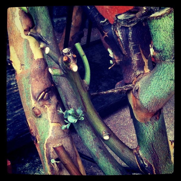 ユーカリ グニー剪定めちゃめちゃ重かった〜。ビール休憩中