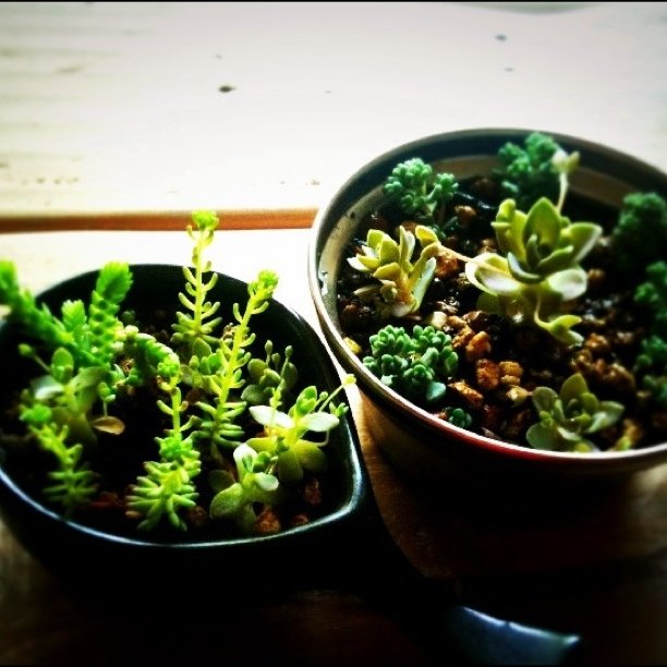 子持ち蓮華とセダムの計量カップ盛り、完成!