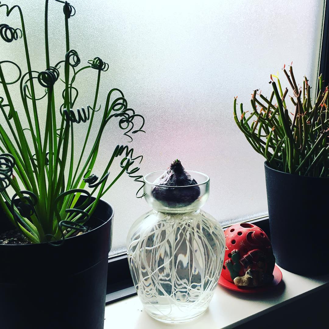 ヒヤシンス、ちょっとだけ芽が出てきました。花はそんなに好きじゃないけどこの景色は好きです。Albuca spiralis cv. 'Frizzle sizzle' Hyacinthus orientalis Euphorbia tirucalli #window #plants #plantlove #rainyday #sundaymorning #iphonegraphy #lovemyhouse #inmyroom #growsomethinggreen #アルブカ #ミルクブッシュ