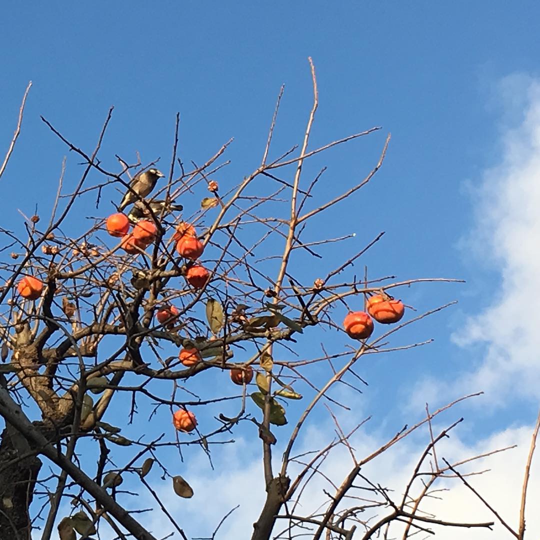 散歩。近所の鳥はよく柿食う客だ。凄い勢いで食べてた。甘いのかな? #neighborhood #bird #kaki #bluesky #saturday #afternoon #柿 #鳥