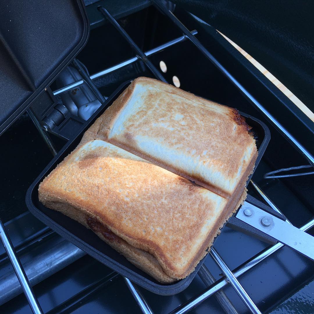 薪拾いに出てる間に野良猫にかじられたパンで朝食ホットサンド。昨日少し取っておいたハンバーグはさみ。激ウマ。 #morning #breakfast #camping #outdoor #bawloo #キャンプ #朝ごはん 薪拾いに出てる間に野良猫にかじられたパンで朝食ホットサンド。昨日少し取っておいたハンバーグはさみ。激ウマ。 #morning #breakfast #camping #outdoor #bawloo #キャンプ #朝ごはん