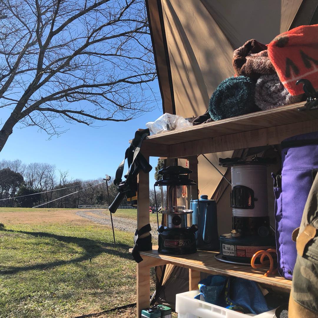 今年はちゃんと車がうごいてくれました。風が強いけど、中は快適。旦那さんお手製棚ははめ込み組み立て式。#camping #newyearseve #キャンプ #年越しキャンプ #夫婦キャンプ #月1キャンプ