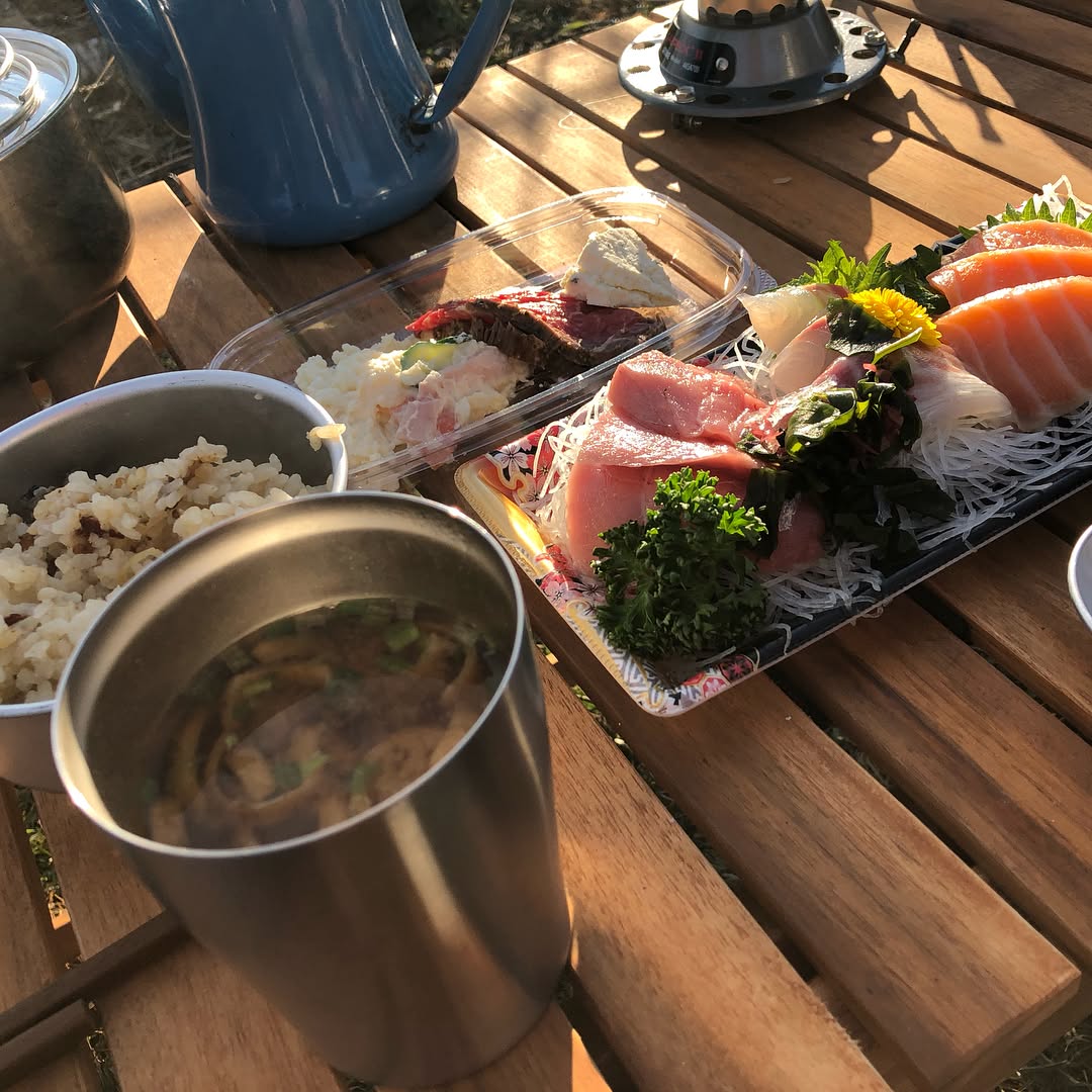 朝ごはんから朝に遡り。美味しかった、マイナス4度は寒かった。 #breakfast #yammy #sashimi #coffee #sunrise #camping #cold #刺身定食 #炊き込み牡蠣ご飯  #コーヒー #キャンプ #夫婦キャンプ