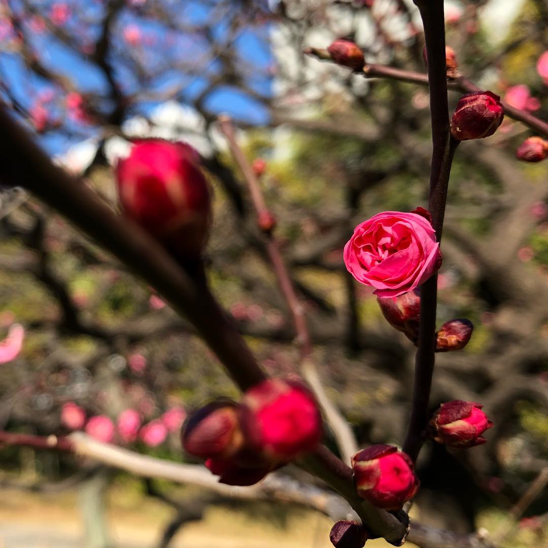 木陰ランチ。完全に咲いた状態よりこのぐらいが好き。 #hamarikyu #spring #plum #lunchtime #浜離宮恩賜庭園 #年パス #八重寒紅 #ポカポカ #花好きな人と繋がりたい