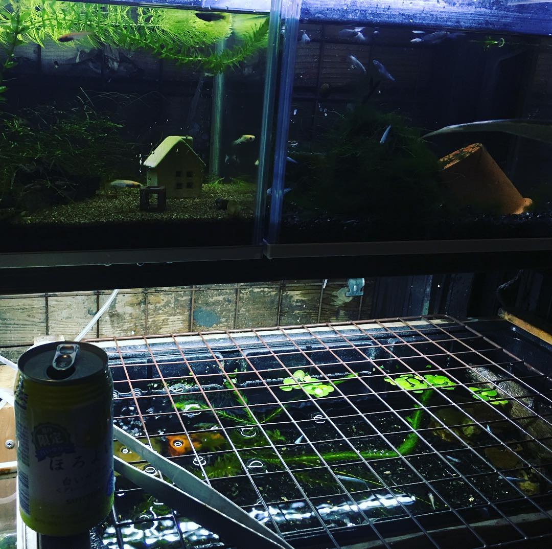 Forgat my house key! Waiting for my husband 鍵を忘れて…デッキで主人の帰りをめだか眺めながら缶チューハイを飲みながら待つの図。蚊除けスプレー外に出しといて良かった。何より涼しくて良かった。 #killifish #めだか #鍵忘れた #waiting #aquarium