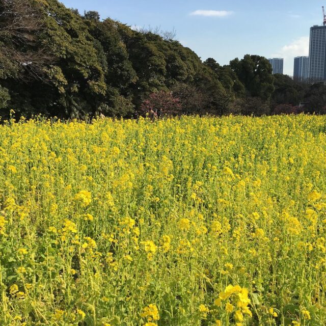 rape flower 日向ランチ。10月に種まきしたという菜の花かなり咲いてます。 #hamarikyu #flowerpower #floweroftheday #lunchtime #sky #clouds