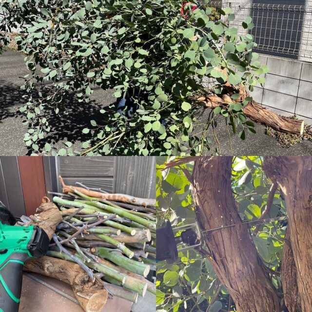 レシプロソー日和。遂に!剪定が楽になった私は小枝で練習。ユーカリをズバッと。巨木をやったのは旦那さんですがヘトヘト、お腹空いた〜。 #レシプロソー #剪定 #ユーカリ #ポポラス #eucalyptus #saturday