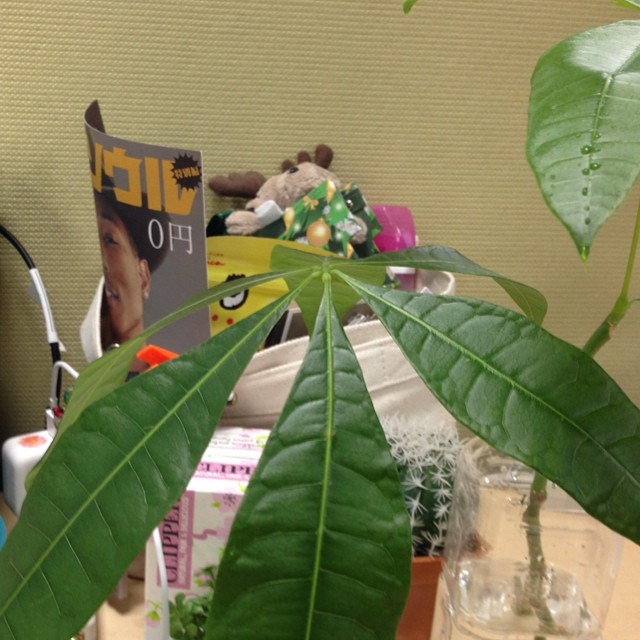 My office職場にいた瀕死のパキラを引き取り、仕立て直しでカットした子を水栽培してます。元木より元気 花瓶持ってこようかな…。 #pachira #office #green #growing #tgif