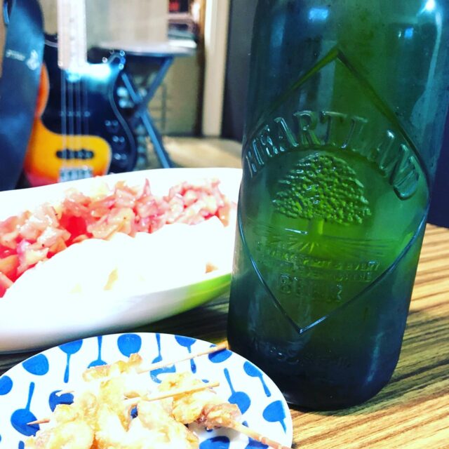 今日はハートランドで晩酌。いつもは黒ラベルですが、たまに無性に飲みたくなる。うちのシェフが美味しい鶏胸肉のつまみを作ってくれた。 手前の爪楊枝に刺さってるのは、鶏皮焼き。#宅飲み #ハートランド #heartland #chiken #cheers #bass