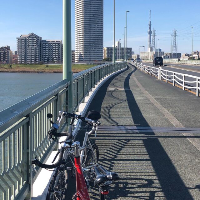 ポタポタと砂町銀座まで。川沿いは走ってて気持ちいい。でももう腿がパンパン…。往復16キロ足らずで…ダメだな。帰りには工場長宅に立ち寄って、またすごい工作を見せてもらいました。1枚目、遠くで尖ってるのは、たぶんスカイツリー。#ポタリング #ミニベロ #cycling #escapemini1 #giant