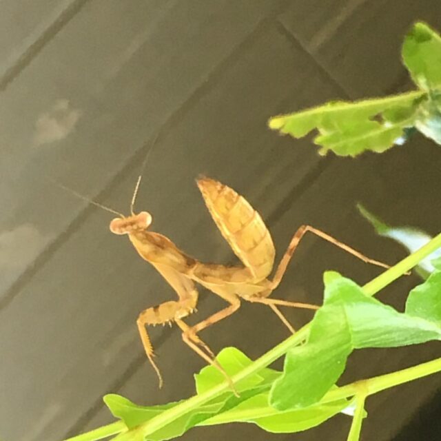 久しぶり。朝からめだかの水替えやら充実の土曜日。アチいですね*(^o^)/* つるバラの葉が食われまくり…の犯人達のすぐ近くのトネリコの木に捕食者発見。180度回転の図。目があうとかたまるのが、また可愛い。#happy #mantis #inmygarden #insect #カマキリ #庭のカマキリ