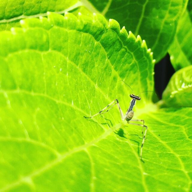 子カマキリ、このあと目があって逃げられちゃいました(笑)他にも3匹🙂 #虫といっしょに庭づくり #カマキリ #baby #mantis #backshot #bugslife #lovemyhouse #gardening #紫陽花