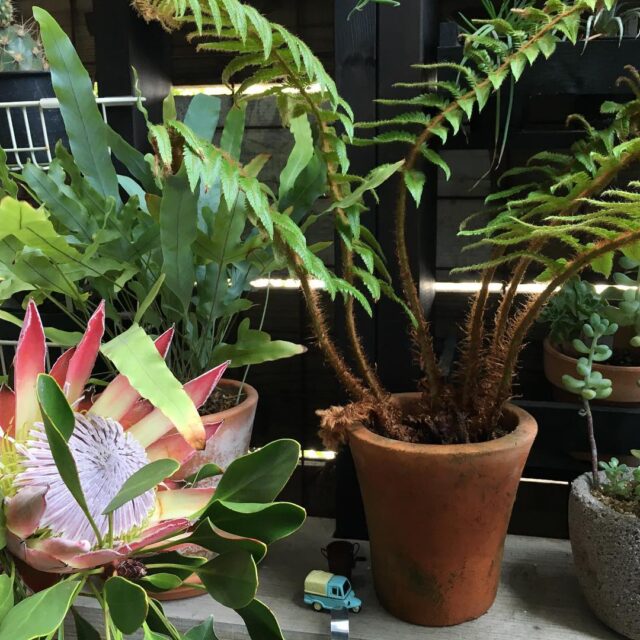 ヒカゲヘゴ、やはりずっと水耕栽培は難しい…というか元気がないので、腐葉土3赤玉7で鉢植えしました。小さい方はここで頑張ってもらいます。大きい方はまたお風呂です。昨日のキングプロテアはうねりがすごいので、太めのゴムで軽く固定、ここに決定しました。#fern #replant #gardening #ig_garden #gardeningtips #nature #plantlove #plants #growsomethinggreen #instagardeners_feature #nofilter #iphonegraphy #kingprotea #lovemyhouse #wooddeck #lovely #ヒカゲヘゴ #キングプロテア #平澤剛生花店