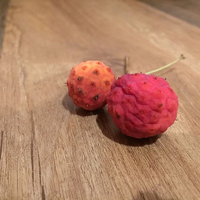 かわいくていい色うちのヤマボウシの実。明日食べてみようかな。甘いらしいです! Kousa Dogwood #fruits #gardening #pretty #color #picoftheday #plantlove #lovemyhouse #ヤマボウシ