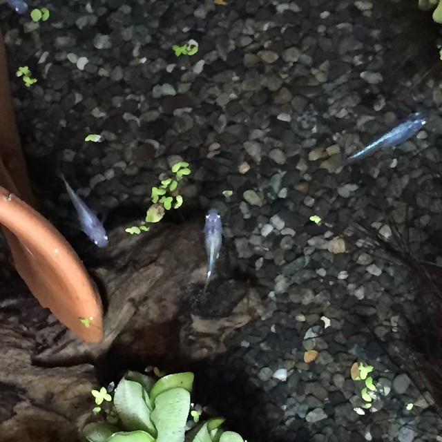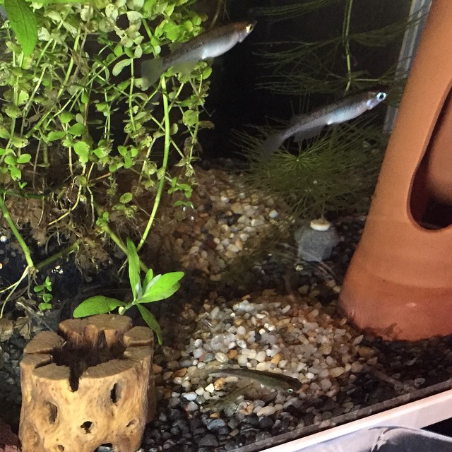 睡蓮鉢の黒めだか達、見えな過ぎなので水槽増やして引越ししました。左手前のゴツゴツはサボテン。ミナミヌマエビの遊具です#killifish #ricefish #biotope #めだか #黒めだか #picoftheday #plantlove #ビオトープ #ナイター